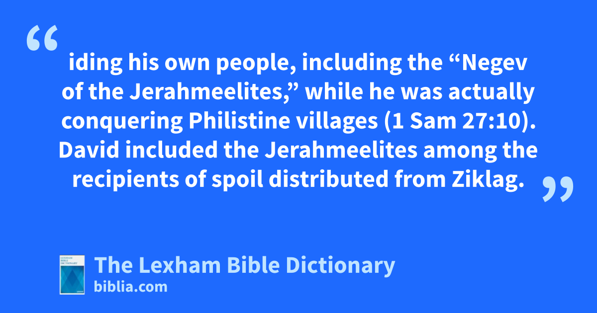 Jerahmeelites (יְרַחְמְאֵלִי, yerachme'eliy). The descendants of Jerahmeel, of the tribe of Judah (1 Sam 27:10; 30:29). King David told Achish, king of Gath, that he was raiding his own people, including the “Negev of the Jerahmeelites,” while he was actually conquering Philistine villages (1 Sam 27:10). David included the Jerahmeelites among the recipients of spoil distributed from Ziklag.