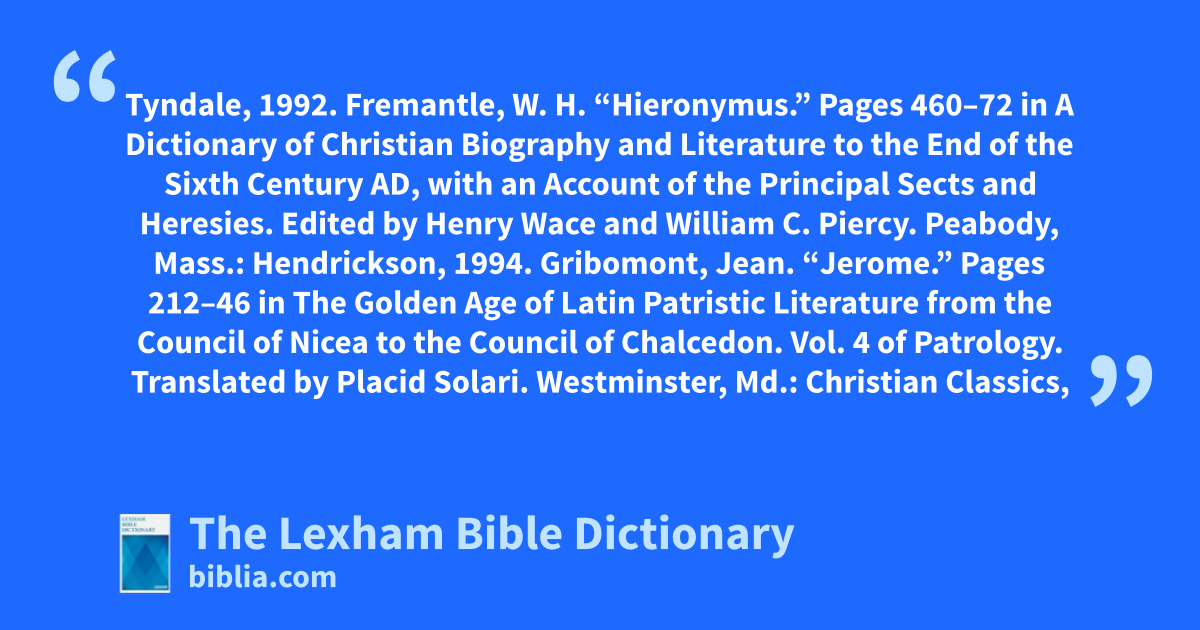 Bryer, K. J. “Jerome.” Pages 356–57 in Who’s Who in Christian History. Edited by J. D. Douglas, Philip W. Comfort, and Donald Mitchell. Wheaton, Ill.: Tyndale, 1992.