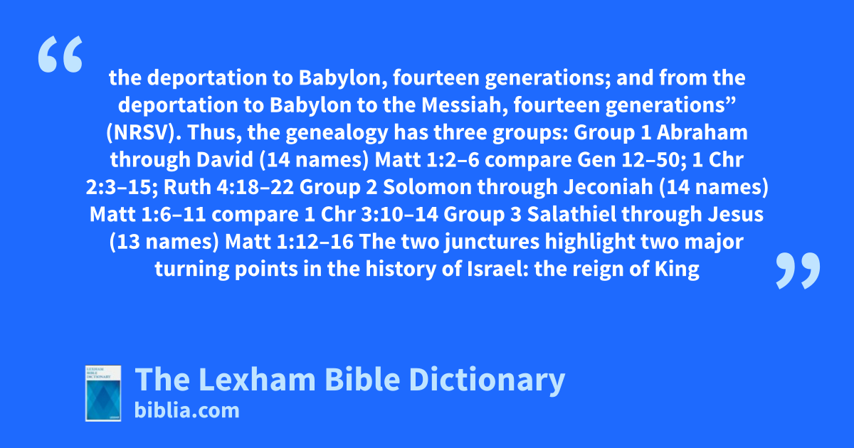 Matthew begins his genealogy with Abraham. The names in the genealogy are separated into three groups of 14 generations each. In Matthew 1:17, Matthew states the structure of his genealogy: “So all the generations from Abraham to David are fourteen generations; and from David to the deportation to Babylon, fourteen generations; and from the deportation to Babylon to the Messiah, fourteen generations” (NRSV). Thus, the genealogy has three groups: