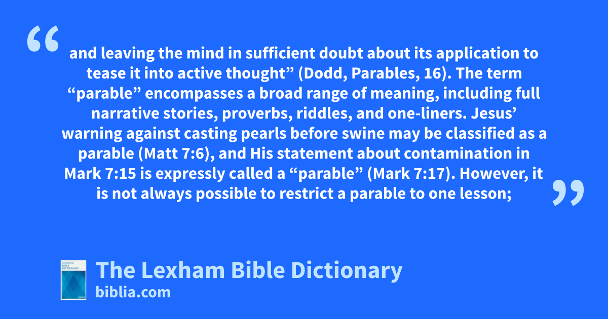 C.H. Dodd defines a parable as “a metaphor or simile drawn from nature or common life, arresting the hearer by its vividness or strangeness, and leaving the mind in sufficient doubt about its application to tease it into active thought” (Dodd, Parables, 16). The term “parable” encompasses a broad range of meaning, including full narrative stories, proverbs, riddles, and one-liners. Jesus’ warning against casting pearls before swine may be classified as a parable (Matt 7:6), and His statement about contamination in Mark 7:15 is expressly called a “parable” (Mark 7:17). However, it is not always possible to restrict a parable to one lesson; the parable of the Prodigal Son and several others were designed with more than one point in mind.