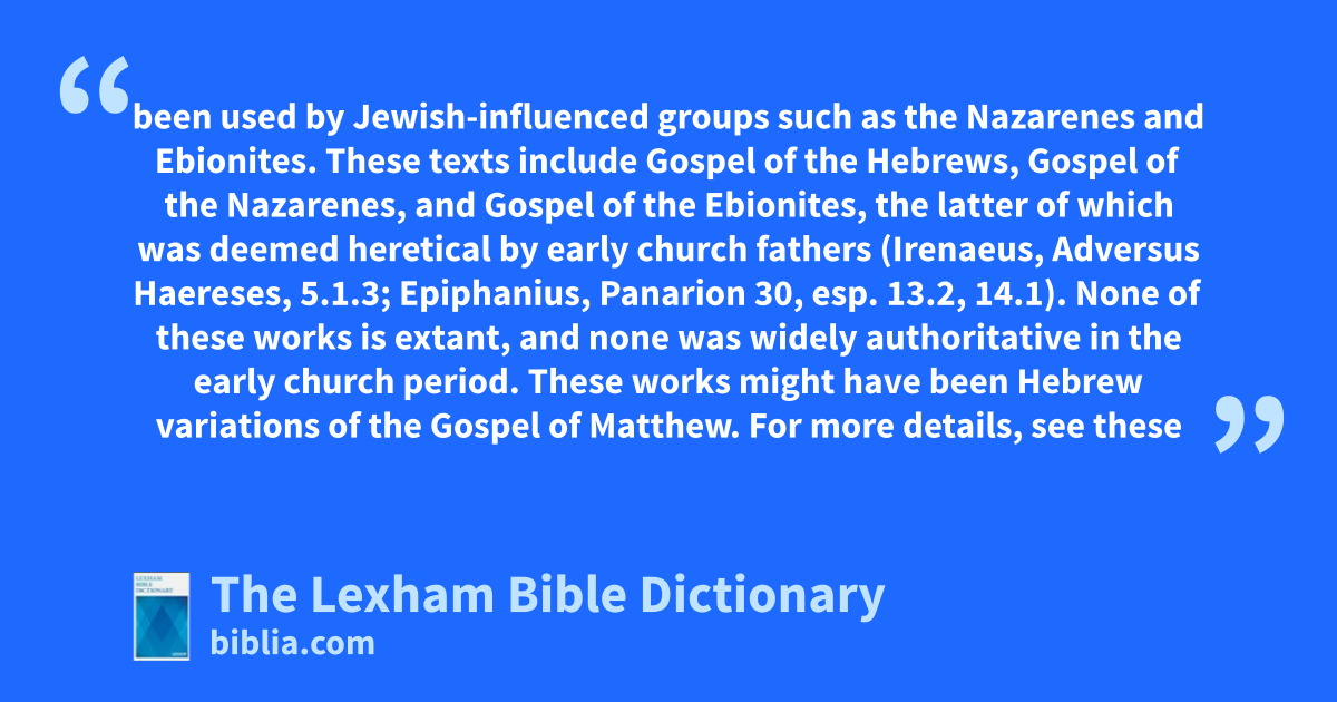 For more details, see these articles on individual texts: Gospel of the Hebrews; Gospel of the Nazarenes; Gospel of the Ebionites; and Matthew, Gospel of, Hebrew Version of.