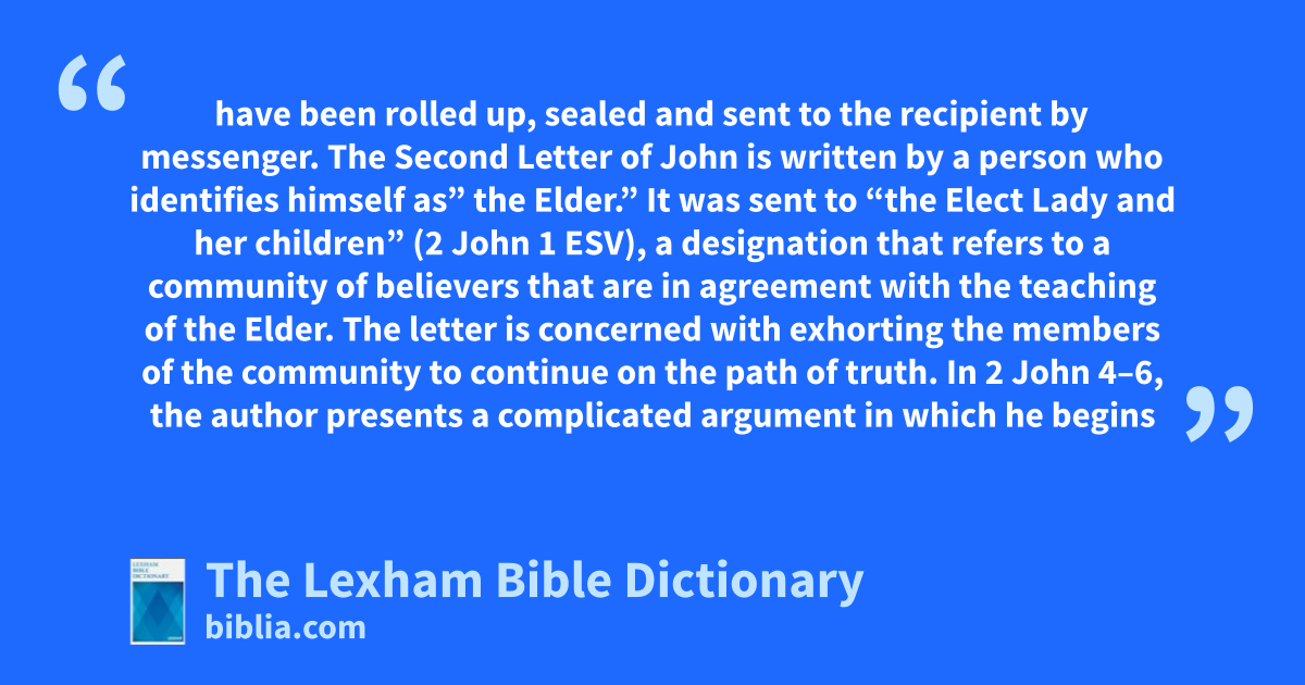 The Second Letter of John is a true letter. (See the characteristics of the typical ancient letter described above.) In its original form, it probably filled one side of a sheet of papyrus. The sheet would then have been rolled up, sealed and sent to the recipient by messenger. The Second Letter of John is written by a person who identifies himself as” the Elder.” It was sent to “the Elect Lady and her children” (2 John 1 ESV), a designation that refers to a community of believers that are in agreement with the teaching of the Elder.