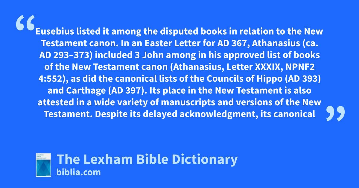Third John was recognized as part of the New Testament canon later than other books, likely because of its short length and debated authorship. In ad 325 Eusebius listed it among the disputed books in relation to the New Testament canon. In an Easter Letter for ad 367, Athanasius (ca. ad 293–373) included 3 John among in his approved list of books of the New Testament canon (Athanasius, Letter XXXIX, NPNF2 4:552), as did the canonical lists of the Councils of Hippo (ad 393) and Carthage (ad 397). Its place in the New Testament is also attested in a wide variety of manuscripts and versions of the New Testament. Despite its delayed acknowledgment, its canonical status remains unchallenged today.