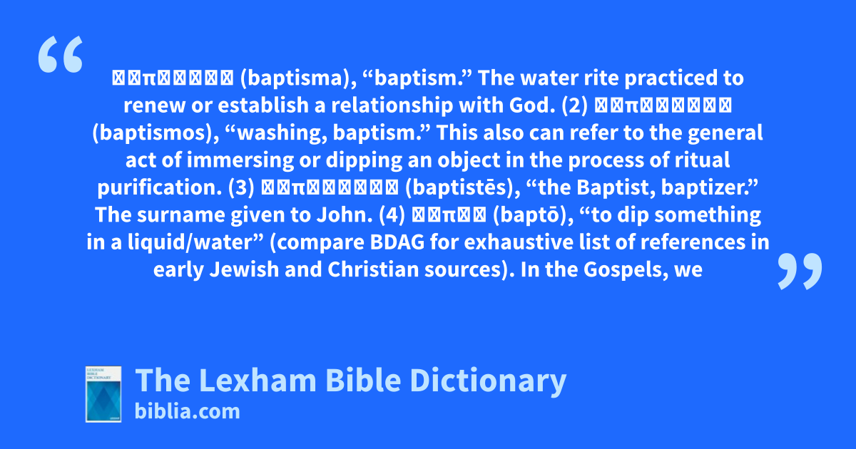 (1) βάπτισμα (baptisma), “baptism.” The water rite practiced to renew or establish a relationship with God.