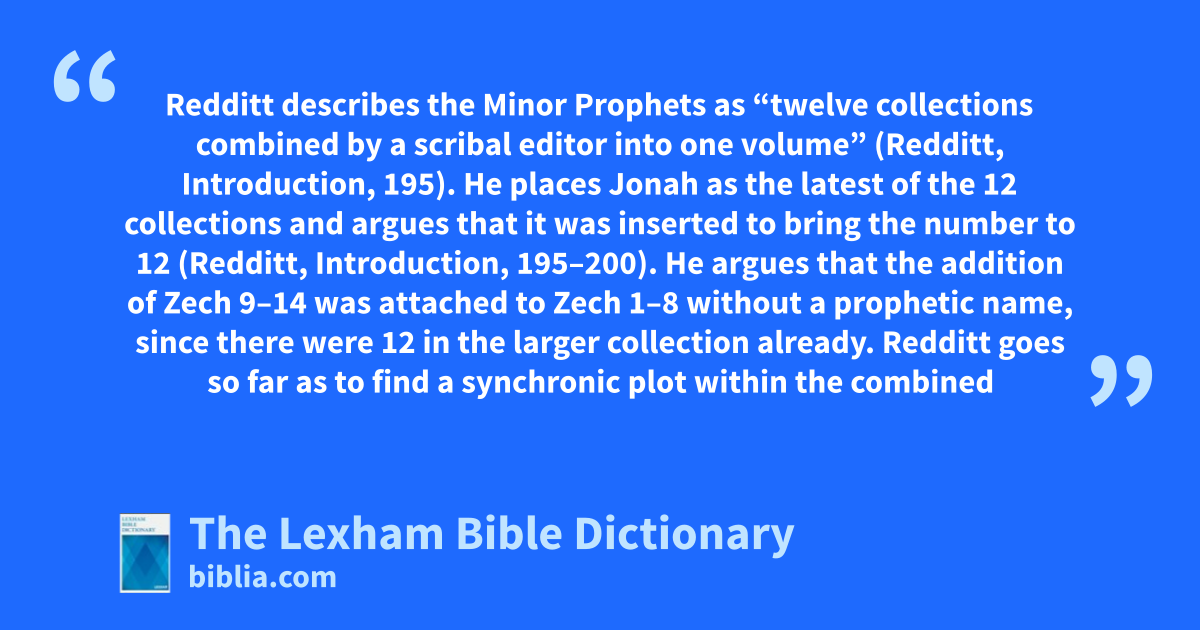 Redditt describes the Minor Prophets as “twelve collections combined by a scribal editor into one volume” (Redditt, Introduction, 195). He places Jonah as the latest of the 12 collections and argues that it was inserted to bring the number to 12 (Redditt, Introduction, 195–200). He argues that the addition of Zech 9–14 was attached to Zech 1–8 without a prophetic name, since there were 12 in the larger collection already. Redditt goes so far as to find a synchronic plot within the combined Book of the Twelve: