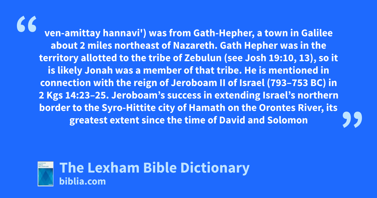 Jonah the Prophet (יוֹנָה בֶן־אֲמִתַּי, yonah ven-amittay). The main figure in the book of Jonah. Jonah son of Amittai the prophet (יוֹנָה בֶן־אֲמִתַּי הַנָּבִיא, yonah ven-amittay hannavi') was from Gath-Hepher, a town in Galilee about 2 miles northeast of Nazareth. Gath Hepher was in the territory allotted to the tribe of Zebulun (see Josh 19:10, 13), so it is likely Jonah was a member of that tribe. He is mentioned in connection with the reign of Jeroboam II of Israel (793–753 bc) in 2 Kgs 14:23–25. Jeroboam’s success in extending Israel’s northern border to the Syro-Hittite city of Hamath on the Orontes River, its greatest extent since the time of David and Solomon (1 Kgs 8:65; 1 Chr 13:5), is said to have happened “according to the word of Yahweh, the God of Israel, which he spoke by the hand of his servant Jonah the son of Amittai the prophet, who was from Gath-Hepher” (2 Kings 14:25). Jonah’s message is assumed to have been delivered during Jeroboam’s reign, dating the prophet’s ministry to the mid-8th century bc.
