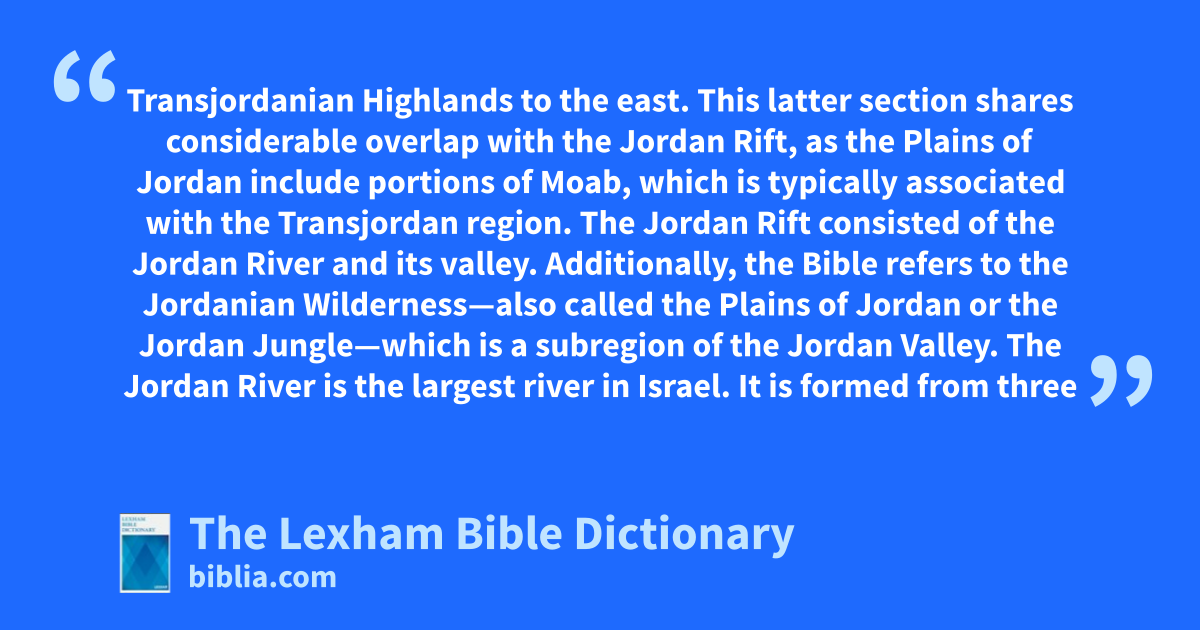 The Jordan Rift was one of the four major vertical divisions of Israel, with the Coastal Plains and the Central Mountain Range to the west and the Transjordanian Highlands to the east. This latter section shares considerable overlap with the Jordan Rift, as the Plains of Jordan include portions of Moab, which is typically associated with the Transjordan region. The Jordan Rift consisted of the Jordan River and its valley. Additionally, the Bible refers to the Jordanian Wilderness—also called the Plains of Jordan or the Jordan Jungle—which is a subregion of the Jordan Valley.