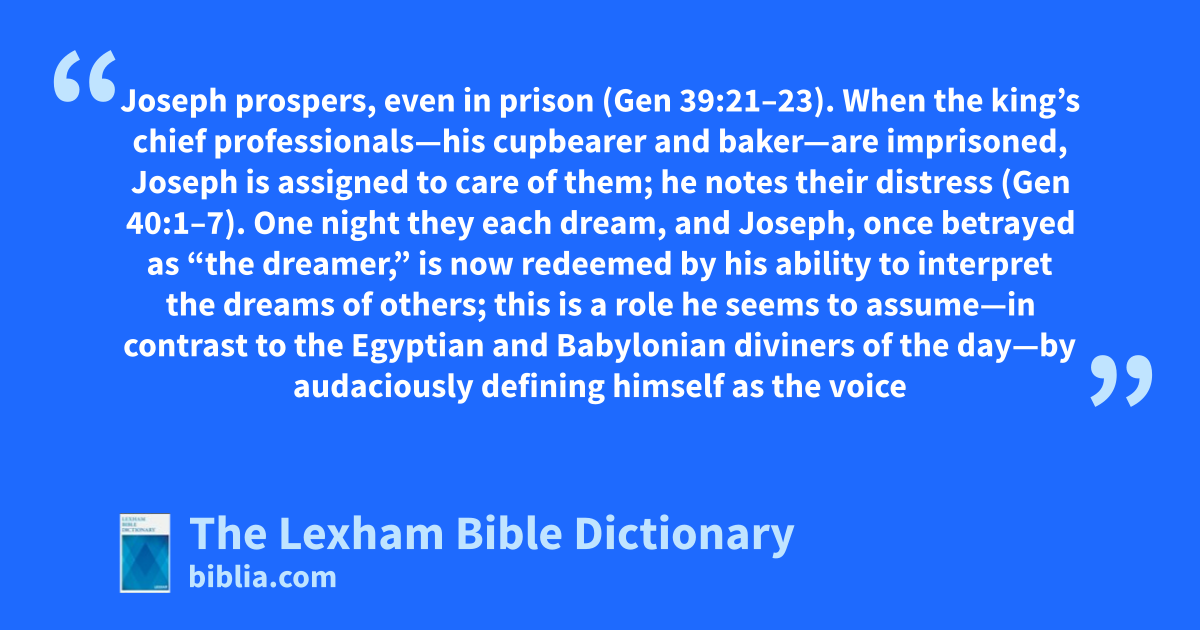Joseph prospers, even in prison (Gen 39:21–23). When the king’s chief professionals—his cupbearer and baker—are imprisoned, Joseph is assigned to care of them; he notes their distress (Gen 40:1–7). One night they each dream, and Joseph, once betrayed as “the dreamer,” is now redeemed by his ability to interpret the dreams of others; this is a role he seems to assume—in contrast to the Egyptian and Babylonian diviners of the day—by audaciously defining himself as the voice of God: “Do not interpretations belong to God? Please tell them to me” (Gen 40:8; Custis, Genesis, Gen 40; Sarna, Genesis, 281). The cupbearer’s dream foretells his pardon (Gen 40:9–15); the baker’s, his death (Gen 40:16–19). Joseph’s interpretations come true in three days’ time and though the cupbearer is indeed reinstated, he forgets to mention Joseph to his superiors (Gen 40:20–22). Joseph remains in prison for two more years, completing a slavery and imprisonment that has lasted 13 years (Gen 40:23–41:1).