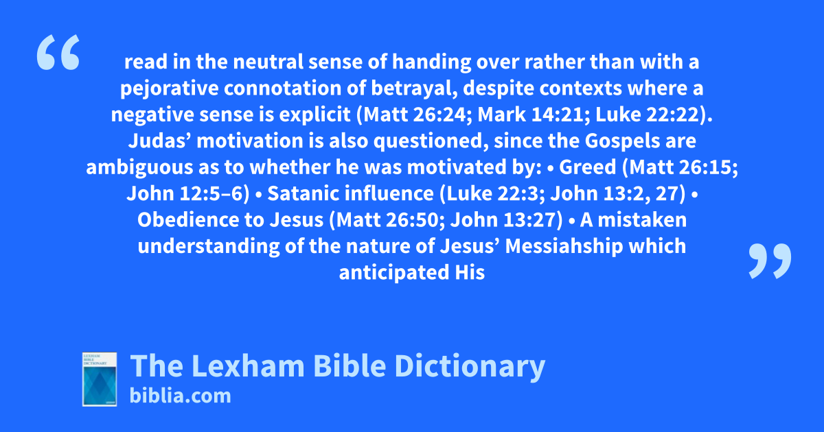 The portrait of Judas that emerges from the New Testament accounts can be probed in many ways. Brown and Klassen argue that παραδίδωμι (paradidōmi) should be read in the neutral sense of handing over rather than with a pejorative connotation of betrayal, despite contexts where a negative sense is explicit (Matt 26:24; Mark 14:21; Luke 22:22). Judas’ motivation is also questioned, since the Gospels are ambiguous as to whether he was motivated by: