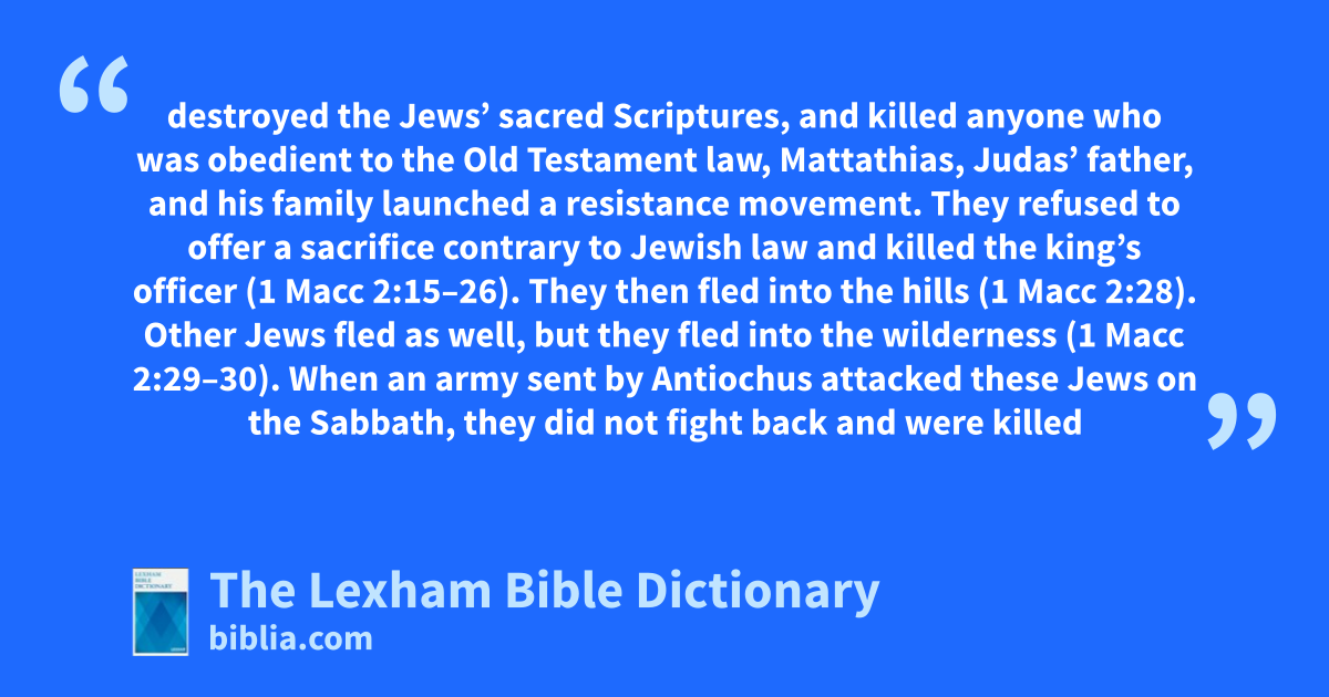 The first two chapters of 1 Maccabees provide the background to the wars of Judas Maccabeus. When Antiochus IV Epiphanes defiled the temple, destroyed the Jews’ sacred Scriptures, and killed anyone who was obedient to the Old Testament law, Mattathias, Judas’ father, and his family launched a resistance movement. They refused to offer a sacrifice contrary to Jewish law and killed the king’s officer (1 Macc 2:15–26). They then fled into the hills (1 Macc 2:28). Other Jews fled as well, but they fled into the wilderness (1 Macc 2:29–30). When an army sent by Antiochus attacked these Jews on the Sabbath, they did not fight back and were killed (1 Macc 2:31–38). Upon hearing of this, Mattathias and his family vowed to “fight against anyone who comes to attack … on the Sabbath day,” lest the Jews become extinct (1 Macc 2:41 NRSV).
