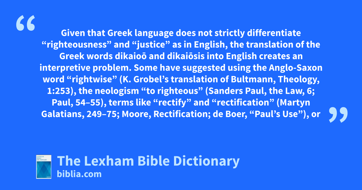 Justification is the biblical teaching about how believers are declared to be right before God even though they are not actually righteous in themselves. Given that Greek language does not strictly differentiate “righteousness” and “justice” as in English, the translation of the Greek words dikaioō and dikaiōsis into English creates an interpretive problem. Some have suggested using the Anglo-Saxon word “rightwise” (K. Grobel’s translation of Bultmann, Theology, 1:253), the neologism “to righteous” (Sanders Paul, the Law, 6; Paul, 54–55), terms like “rectify” and “rectification” (Martyn Galatians, 249–75; Moore, Rectification; de Boer, “Paul’s Use”), or even the barbarism “dikaiosify” (Westerholm, Perspectives, 262–63). However, it is probably better to retain the customary translation of “justify” and “justification” and to explain their meaning with reference to usage in the New Testament and articulation in Christian doctrine.