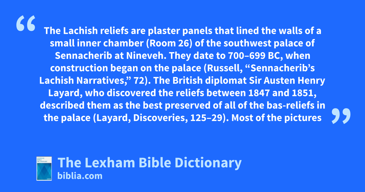 The Lachish reliefs are plaster panels that lined the walls of a small inner chamber (Room 26) of the southwest palace of Sennacherib at Nineveh. They date to 700–699 bc, when construction began on the palace (Russell, “Sennacherib’s Lachish Narratives,” 72). The British diplomat Sir Austen Henry Layard, who discovered the reliefs between 1847 and 1851, described them as the best preserved of all of the bas-reliefs in the palace (Layard, Discoveries, 125–29). Most of the pictures are well-preserved and bear captions, but any cuneiform text that may have been at the top of the slabs is missing. The slabs were taken to the British Museum in 1852.