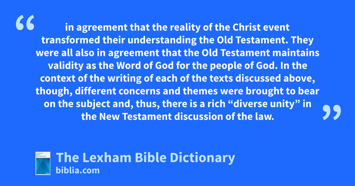 All New Testament writers were in agreement that the reality of the Christ event transformed their understanding the Old Testament. They were all also in agreement that the Old Testament maintains validity as the Word of God for the people of God. In the context of the writing of each of the texts discussed above, though, different concerns and themes were brought to bear on the subject and, thus, there is a rich “diverse unity” in the New Testament discussion of the law.