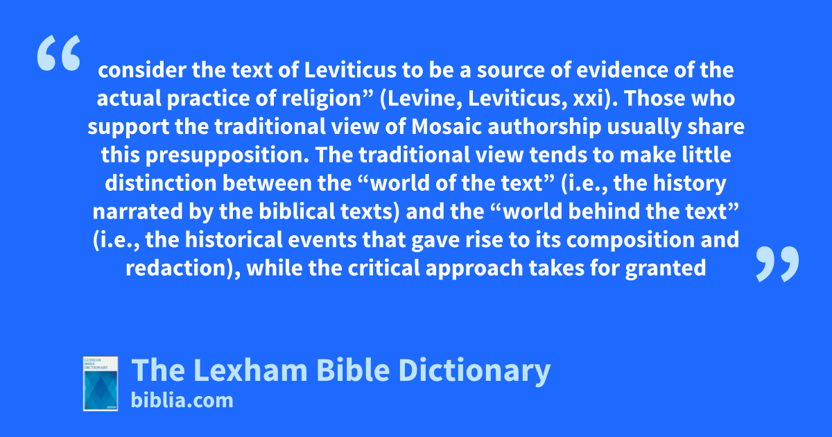 1. Most scholars opt for what is called the “realistic” approach. Levine explains, “We consider the text of Leviticus to be a source of evidence of the actual practice of religion” (Levine, Leviticus, xxi). Those who support the traditional view of Mosaic authorship usually share this presupposition. The traditional view tends to make little distinction between the “world of the text” (i.e., the history narrated by the biblical texts) and the “world behind the text” (i.e., the historical events that gave rise to its composition and redaction), while the critical approach takes for granted the distinction between the two worlds and tends to focus on analyzing the latter.