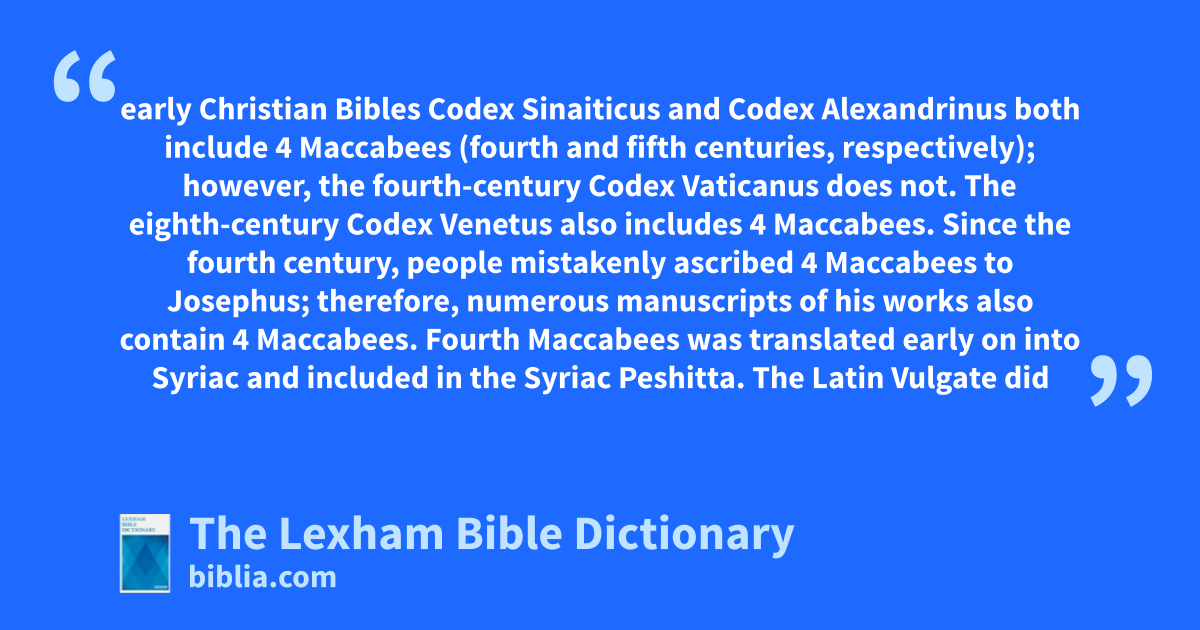 Fourth Maccabees is not included in the Hebrew Bible and as such is noncanonical for the Jewish tradition. Fourth Maccabees is included in some Greek Septuagint manuscripts. The early Christian Bibles Codex Sinaiticus and Codex Alexandrinus both include 4 Maccabees (fourth and fifth centuries, respectively); however, the fourth-century Codex Vaticanus does not. The eighth-century Codex Venetus also includes 4 Maccabees. Since the fourth century, people mistakenly ascribed 4 Maccabees to Josephus; therefore, numerous manuscripts of his works also contain 4 Maccabees. Fourth Maccabees was translated early on into Syriac and included in the Syriac Peshitta. The Latin Vulgate did not include 4 Maccabees. However, there is an Old Latin paraphrase from the late 4th century, known as the Passio Maccabaeorum (“Passion of the Maccabees”), which was occasionally included in medieval Latin Bibles (Signori, “Introduction,” 6).