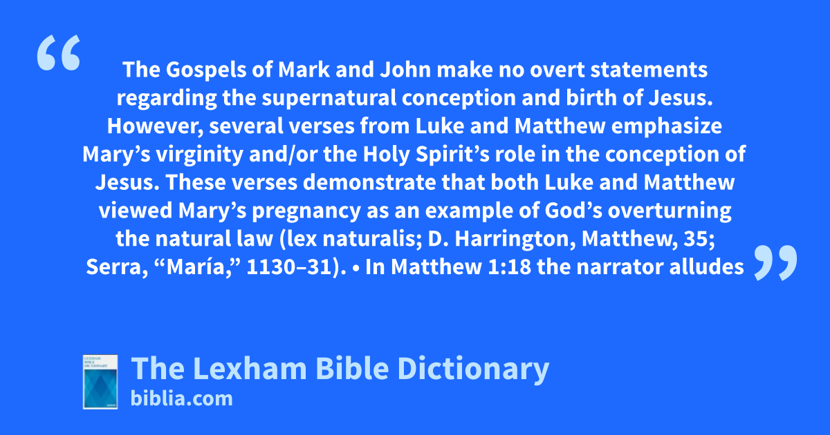 The Gospels of Mark and John make no overt statements regarding the supernatural conception and birth of Jesus. However, several verses from Luke and Matthew emphasize Mary’s virginity and/or the Holy Spirit’s role in the conception of Jesus. These verses demonstrate that both Luke and Matthew viewed Mary’s pregnancy as an example of God’s overturning the natural law (lex naturalis; D. Harrington, Matthew, 35; Serra, “María,” 1130–31).