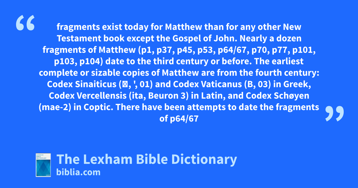 Like the rest of the New Testament books, no original copy or fragment of Matthew’s Gospel exists today. Nevertheless, since Matthew was such a popular text in the early church, more papyrus fragments exist today for Matthew than for any other New Testament book except the Gospel of John. Nearly a dozen fragments of Matthew (p1, p37, p45, p53, p64/67, p70, p77, p101, p103, p104) date to the third century or before. The earliest complete or sizable copies of Matthew are from the fourth century: Codex Sinaiticus (א, ', 01) and Codex Vaticanus (B, 03) in Greek, Codex Vercellensis (ita, Beuron 3) in Latin, and Codex Schøyen (mae-2) in Coptic. There have been attempts to date the fragments of p64/67 as early as the first century (Carsten Thiede), but most textual critics favor a date around ad 200 (e.g., Peter Head, Tommy Wasserman).
