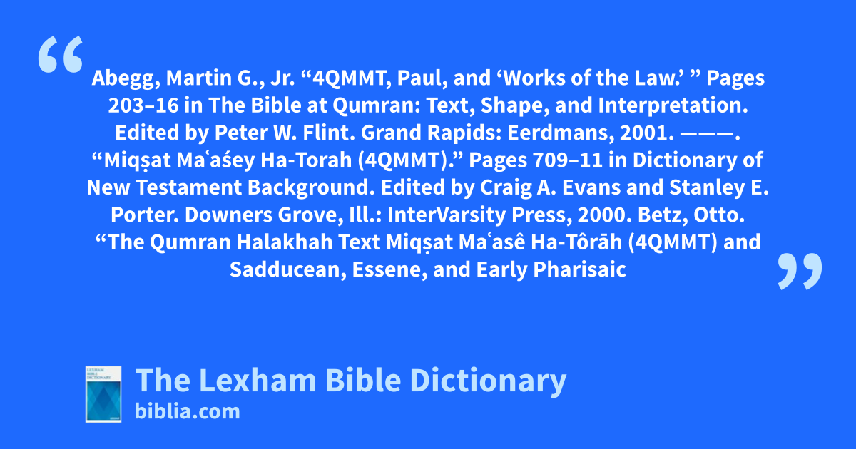 ———. “Miqṣat Maʿaśê Ha-Torah.” Pages 952–54 in Eerdmans Dictionary of Early Judaism. Edited by John J. Collins and Daniel C. Harlow. Grand Rapids: Eerdmans, 2010.
