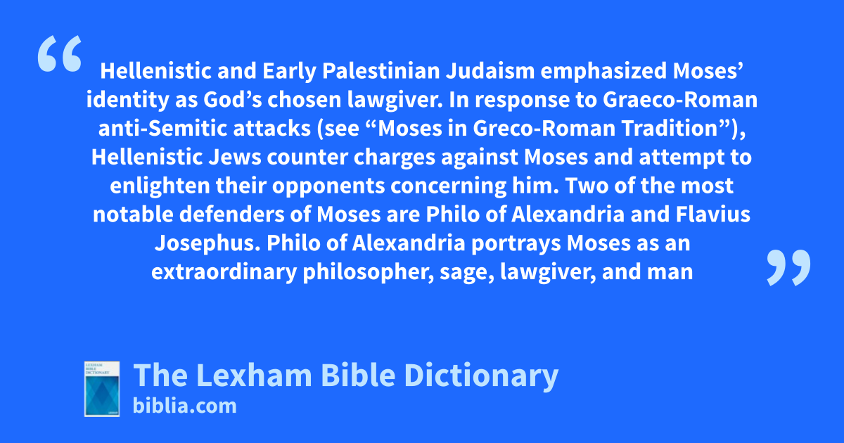Hellenistic and Early Palestinian Judaism emphasized Moses’ identity as God’s chosen lawgiver. In response to Graeco-Roman anti-Semitic attacks (see “Moses in Greco-Roman Tradition”), Hellenistic Jews counter charges against Moses and attempt to enlighten their opponents concerning him. Two of the most notable defenders of Moses are Philo of Alexandria and Flavius Josephus.