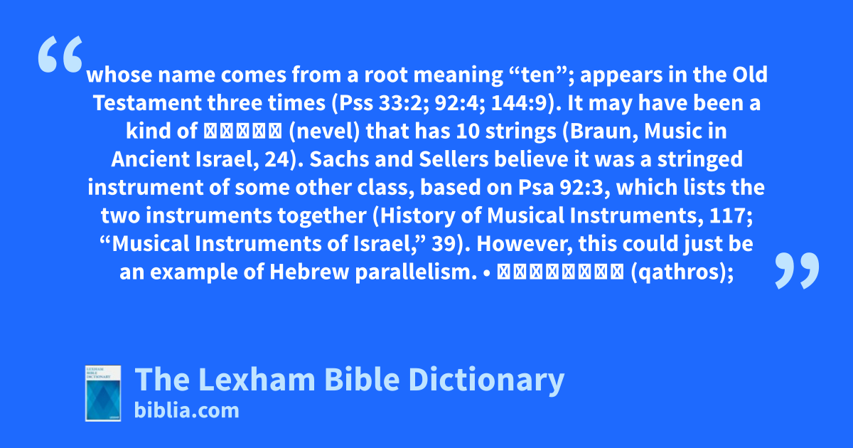 • עָשׂוֹר (asor); “ten-stringed harp”—an instrument whose name comes from a root meaning “ten”; appears in the Old Testament three times (Pss 33:2; 92:4; 144:9). It may have been a kind of נֵבֵל (nevel) that has 10 strings (Braun, Music in Ancient Israel, 24). Sachs and Sellers believe it was a stringed instrument of some other class, based on Psa 92:3, which lists the two instruments together (History of Musical Instruments, 117; “Musical Instruments of Israel,” 39). However, this could just be an example of Hebrew parallelism.