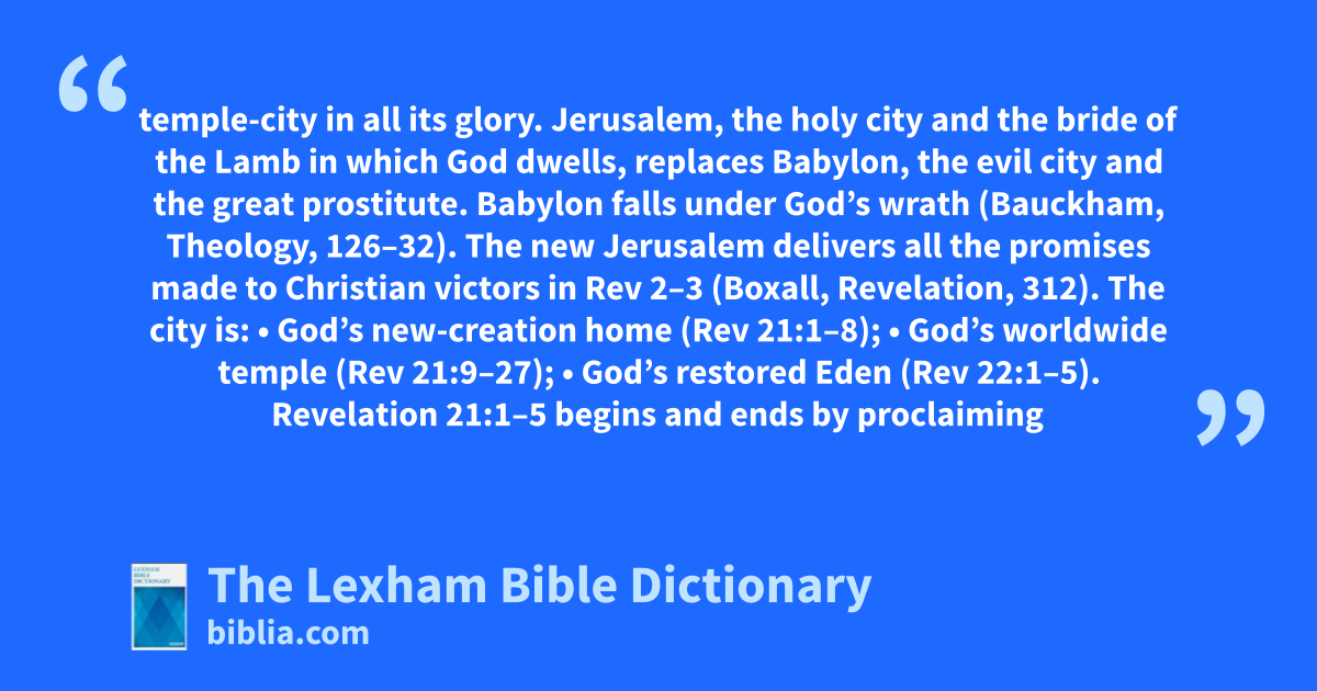 In Revelation 3:12, Christ promises to make victorious believers permanent pillars in His temple and to write on them the name of God and God’s city—the new Jerusalem. Revelation 21:1–22:5 describes this temple-city in all its glory. Jerusalem, the holy city and the bride of the Lamb in which God dwells, replaces Babylon, the evil city and the great prostitute. Babylon falls under God’s wrath (Bauckham, Theology, 126–32). The new Jerusalem delivers all the promises made to Christian victors in Rev 2–3 (Boxall, Revelation, 312). The city is: