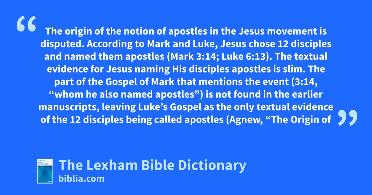 According to Mark and Luke, Jesus chose 12 disciples and named them apostles (Mark 3:14; Luke 6:13). The textual evidence for Jesus naming His disciples apostles is slim. The part of the Gospel of Mark that mentions the event (3:14, “whom he also named apostles”) is not found in the earlier manuscripts, leaving Luke’s Gospel as the only textual evidence of the 12 disciples being called apostles (Agnew, “The Origin of the NT Apostle-Concept: A Review of Research,” 85–90).