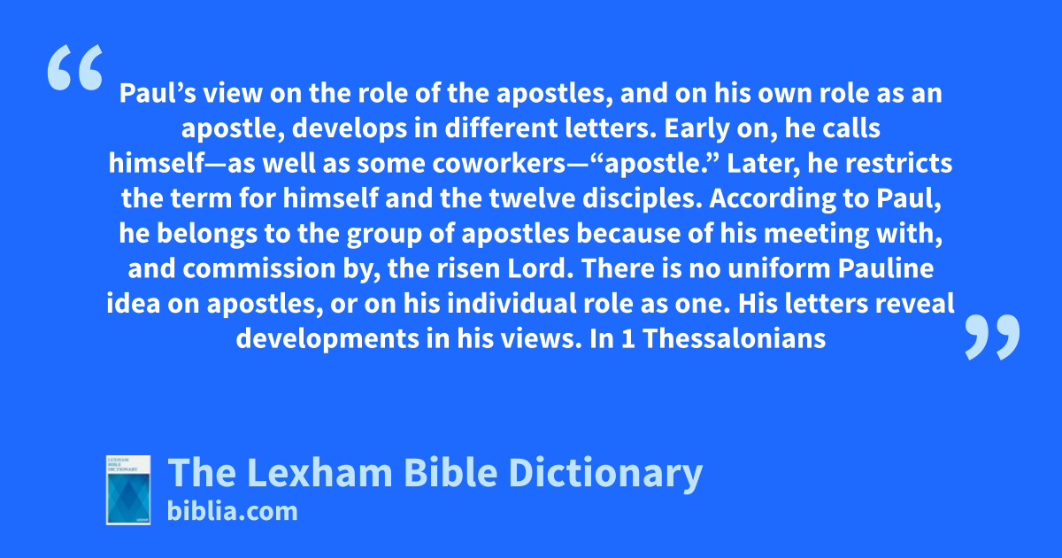 Paul’s view on the role of the apostles, and on his own role as an apostle, develops in different letters. Early on, he calls himself—as well as some coworkers—“apostle.” Later, he restricts the term for himself and the twelve disciples. According to Paul, he belongs to the group of apostles because of his meeting with, and commission by, the risen Lord.