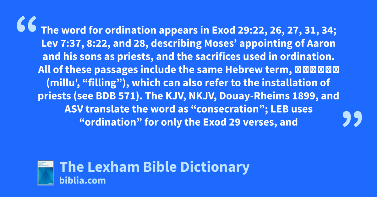 The word for ordination appears in Exod 29:22, 26, 27, 31, 34; Lev 7:37, 8:22, and 28, describing Moses’ appointing of Aaron and his sons as priests, and the sacrifices used in ordination. All of these passages include the same Hebrew term, מִלֻּא (millu', “filling”), which can also refer to the installation of priests (see BDB 571). The KJV, NKJV, Douay-Rheims 1899, and ASV translate the word as “consecration”; LEB uses “ordination” for only the Exod 29 verses, and “consecration” for the three Leviticus passages. While these differences may indicate a legitimate translation issue, they also highlight the difficulty of discussing postbiblical Jewish and Christian practices of ordination, which lack precise biblical antecedents. No biblical Hebrew or Greek term corresponds one-to-one with the contemporary use of “ordination” (Collins, “Ordination,” 339).