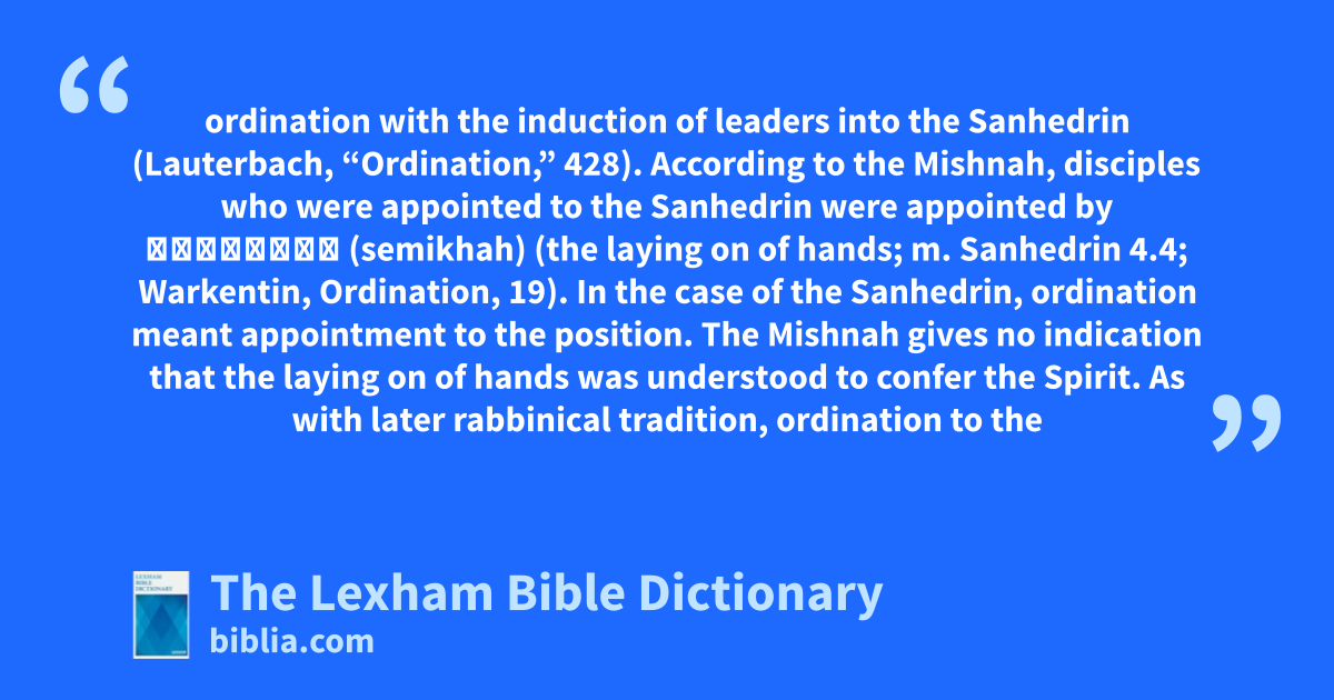 Lauterbach connects the original practice of ordination with the induction of leaders into the Sanhedrin (Lauterbach, “Ordination,” 428). According to the Mishnah, disciples who were appointed to the Sanhedrin were appointed by סְמִיכָה (semikhah) (the laying on of hands; m. Sanhedrin 4.4; Warkentin, Ordination, 19). In the case of the Sanhedrin, ordination meant appointment to the position. The Mishnah gives no indication that the laying on of hands was understood to confer the Spirit. As with later rabbinical tradition, ordination to the Sanhedrin was appointment to a legal post which had no clerical or priestly function. Thus, this type of ordination differed from the later practice of Christian ordination, which authorized the person to duties like administering sacraments (Ehrhardt, “Ordination,” 125–26).