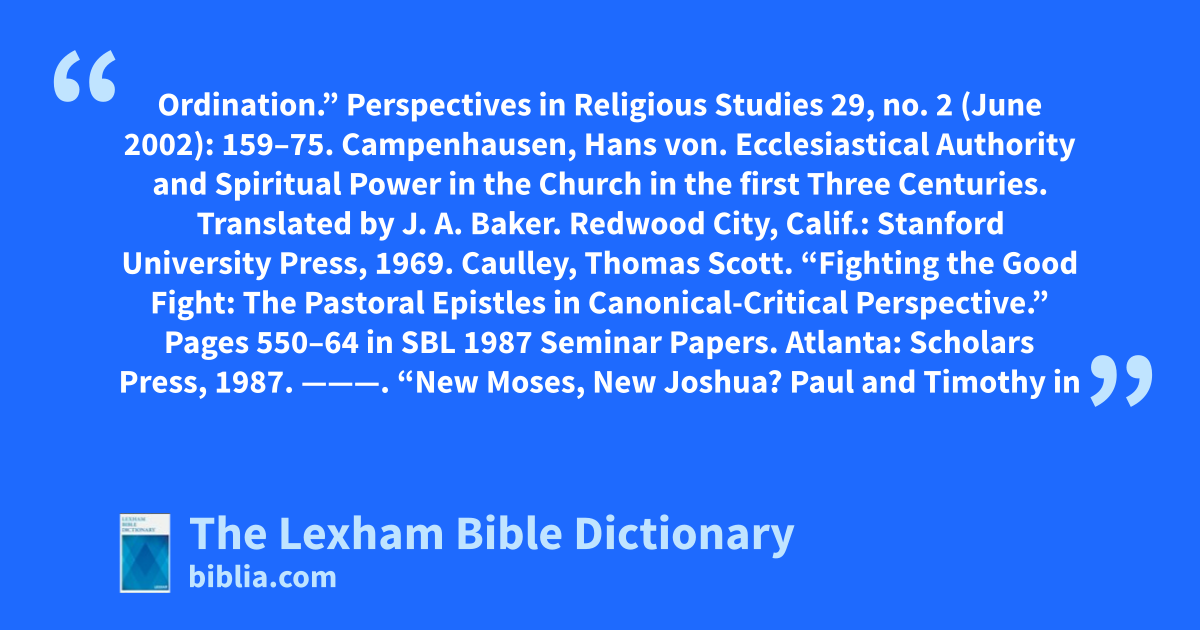 Dowd, Sharyn. “ ‘Ordination” in Acts and the Pastoral Epistles.” Perspectives in Religious Studies 29, no. 2 (June 2002): 205–17.