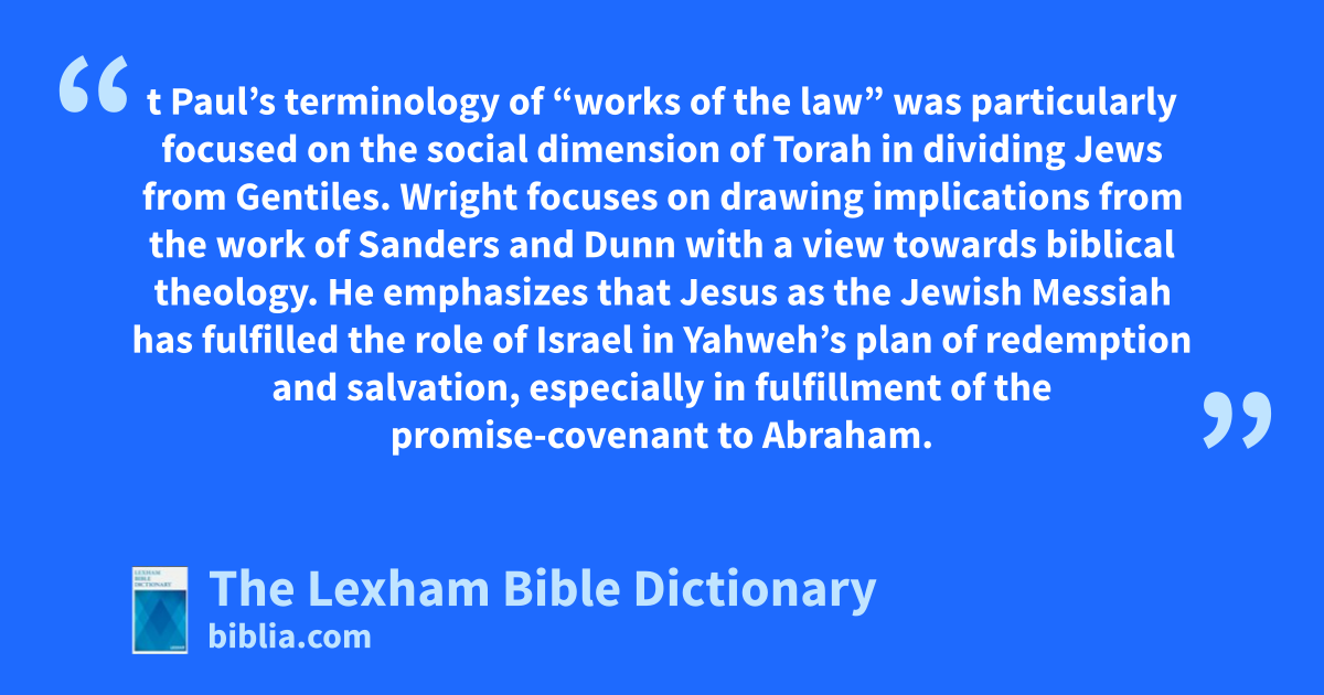 Wright has brought the discussion to a broader audience through his international lectures, popular works, and commentaries. He reacts favorably to Sanders’ “covenantal nomism” pattern and Dunn’s argument that Paul’s terminology of “works of the law” was particularly focused on the social dimension of Torah in dividing Jews from Gentiles. Wright focuses on drawing implications from the work of Sanders and Dunn with a view towards biblical theology. He emphasizes that Jesus as the Jewish Messiah has fulfilled the role of Israel in Yahweh’s plan of redemption and salvation, especially in fulfillment of the promise-covenant to Abraham.