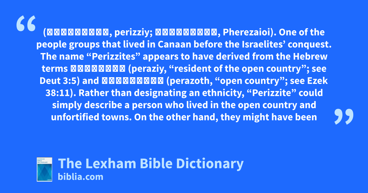 Perizzites (פְּרִזִּי, perizziy; Φερεζαῖοι, Pherezaioi). One of the people groups that lived in Canaan before the Israelites’ conquest. The name “Perizzites” appears to have derived from the Hebrew terms פְּרָזִי (peraziy, “resident of the open country”; see Deut 3:5) and פְּרָזוֹת (perazoth, “open country”; see Ezek 38:11). Rather than designating an ethnicity, “Perizzite” could simply describe a person who lived in the open country and unfortified towns. On the other hand, they might have been a Hurrian subgroup.