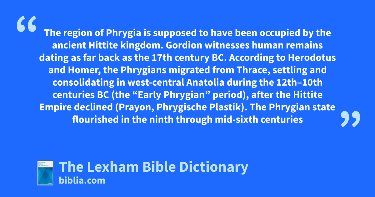 The region of Phrygia is supposed to have been occupied by the ancient Hittite kingdom. Gordion witnesses human remains dating as far back as the 17th century bc. According to Herodotus and Homer, the Phrygians migrated from Thrace, settling and consolidating in west-central Anatolia during the 12th–10th centuries bc (the “Early Phrygian” period), after the Hittite Empire declined (Prayon, Phrygische Plastik).