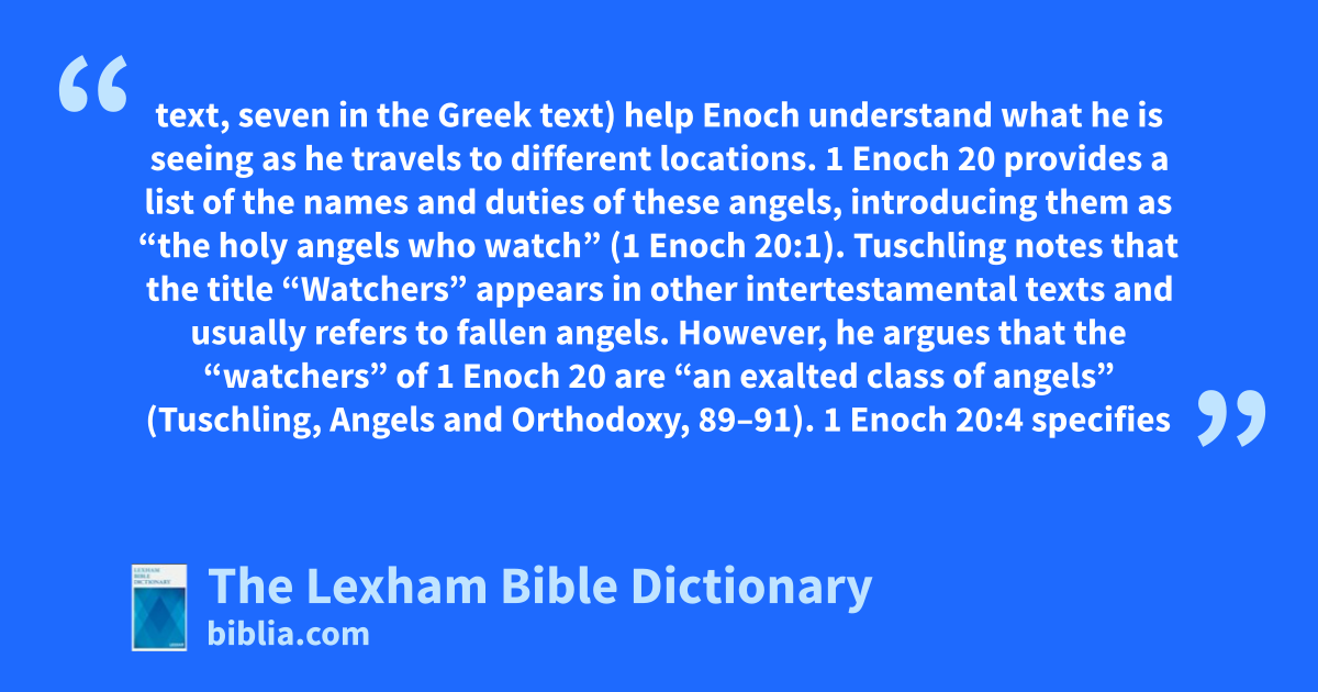 In 1 Enoch 21–36, several angels (six in the Ethiopic text, seven in the Greek text) help Enoch understand what he is seeing as he travels to different locations. 1 Enoch 20 provides a list of the names and duties of these angels, introducing them as “the holy angels who watch” (1 Enoch 20:1). Tuschling notes that the title “Watchers” appears in other intertestamental texts and usually refers to fallen angels. However, he argues that the “watchers” of 1 Enoch 20 are “an exalted class of angels” (Tuschling, Angels and Orthodoxy, 89–91).