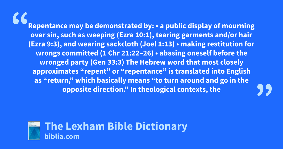 No Hebrew word is an exact equivalent for the English term “repentance.” Repentance was expressed by a number of different actions that show a change in thinking and attitude toward sin and God. Repentance may be demonstrated by: