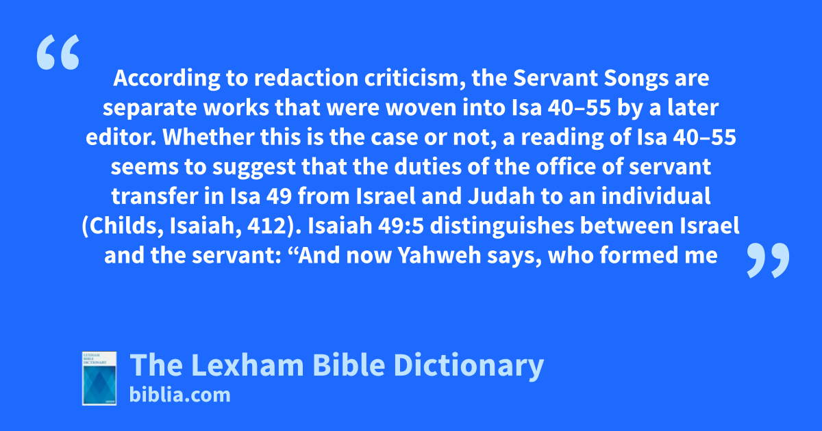 According to redaction criticism, the Servant Songs are separate works that were woven into Isa 40–55 by a later editor. Whether this is the case or not, a reading of Isa 40–55 seems to suggest that the duties of the office of servant transfer in Isa 49 from Israel and Judah to an individual (Childs, Isaiah, 412).