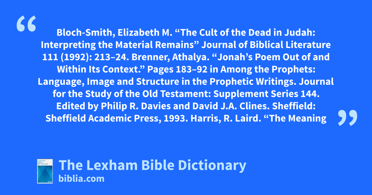 Bloch-Smith, Elizabeth M. “The Cult of the Dead in Judah: Interpreting the Material Remains” Journal of Biblical Literature 111 (1992): 213–24.