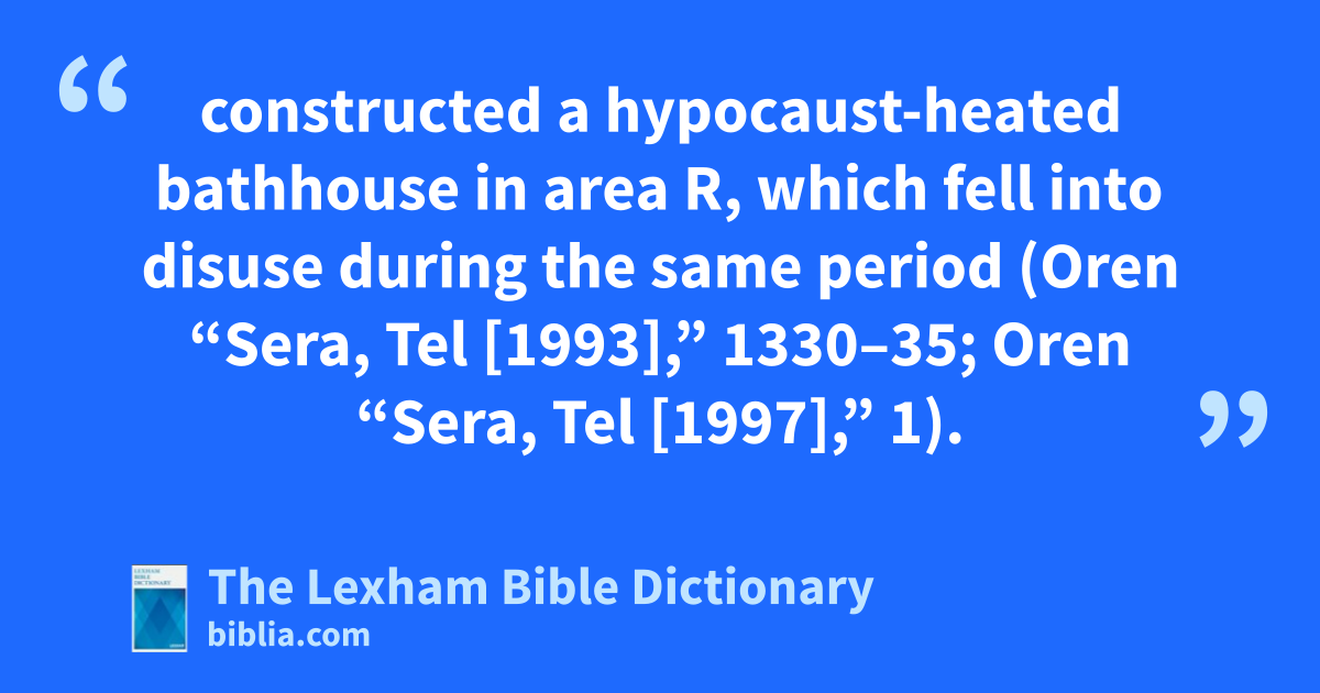 During the fifth—sixth centuries ad, a substantial Byzantine church or monastery built on a stone foundation and decorated with floor mosaics appeared on the summit. Occupants downhill constructed a hypocaust-heated bathhouse in area R, which fell into disuse during the same period (Oren “Sera, Tel [1993],” 1330–35; Oren “Sera, Tel [1997],” 1).