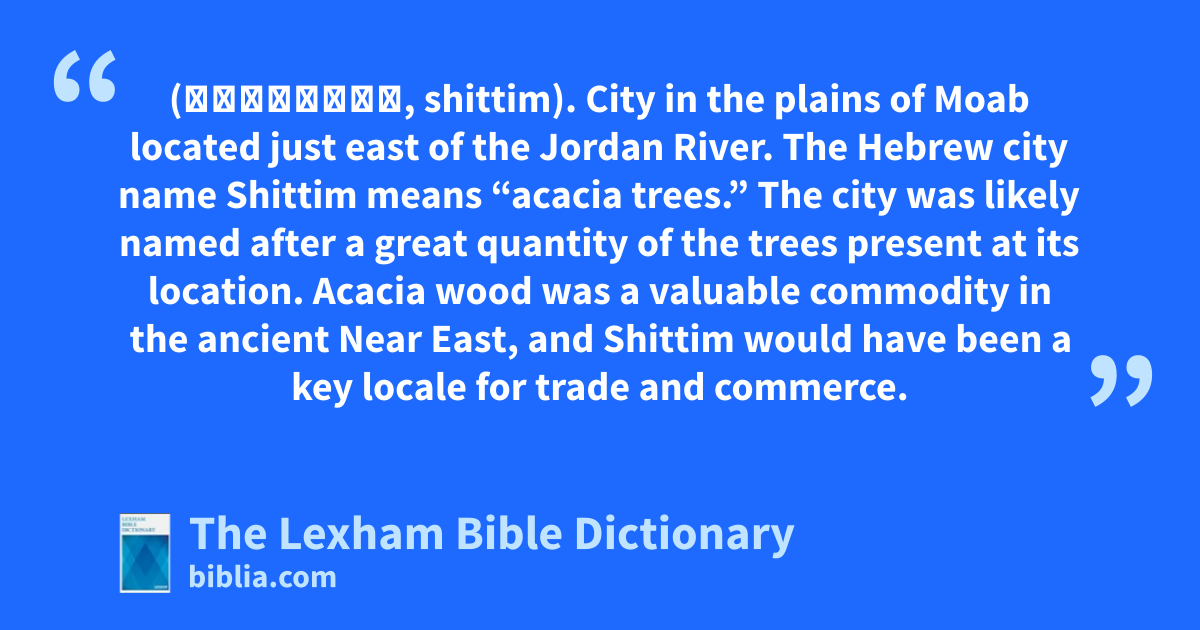 The Hebrew city name Shittim means “acacia trees.” The city was likely named after a great quantity of the trees present at its location. Acacia wood was a valuable commodity in the ancient Near East, and Shittim would have been a key locale for trade and commerce.