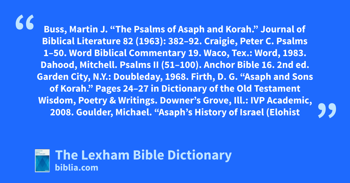 Firth, D. G. “Asaph and Sons of Korah.” Pages 24–27 in Dictionary of the Old Testament Wisdom, Poetry & Writings. Downer’s Grove, Ill.: IVP Academic, 2008.