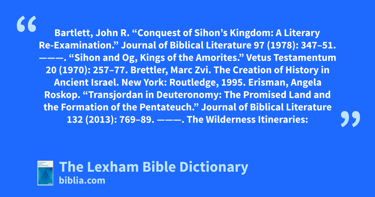 Bartlett, John R. “Conquest of Sihon’s Kingdom: A Literary Re-Examination.” Journal of Biblical Literature 97 (1978): 347–51.