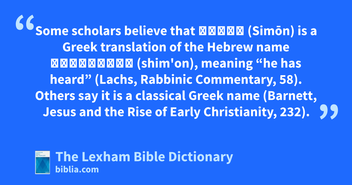 Some scholars believe that Σίμων (Simōn) is a Greek translation of the Hebrew name שִׁמְעוֹן (shim'on), meaning “he has heard” (Lachs, Rabbinic Commentary, 58). Others say it is a classical Greek name (Barnett, Jesus and the Rise of Early Christianity, 232).