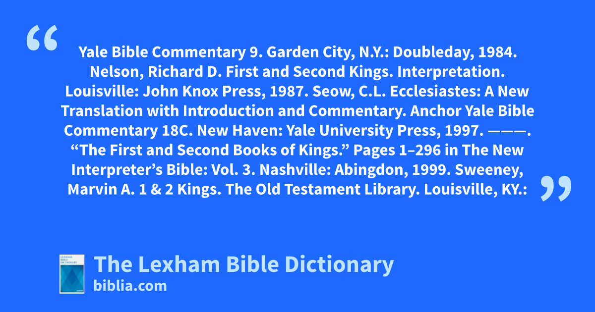Walsh, Jerome T. 1 Kings. Berit Olam. Collegeville, Minn.: The Liturgical Press, 1996.