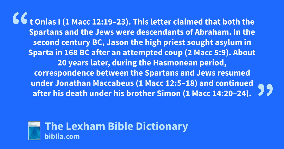 In the fourth century bc, the Spartan king Arius wrote a letter to the Jewish high priest Onias I (1 Macc 12:19–23). This letter claimed that both the Spartans and the Jews were descendants of Abraham. In the second century bc, Jason the high priest sought asylum in Sparta in 168 bc after an attempted coup (2 Macc 5:9). About 20 years later, during the Hasmonean period, correspondence between the Spartans and Jews resumed under Jonathan Maccabeus (1 Macc 12:5–18) and continued after his death under his brother Simon (1 Macc 14:20–24).