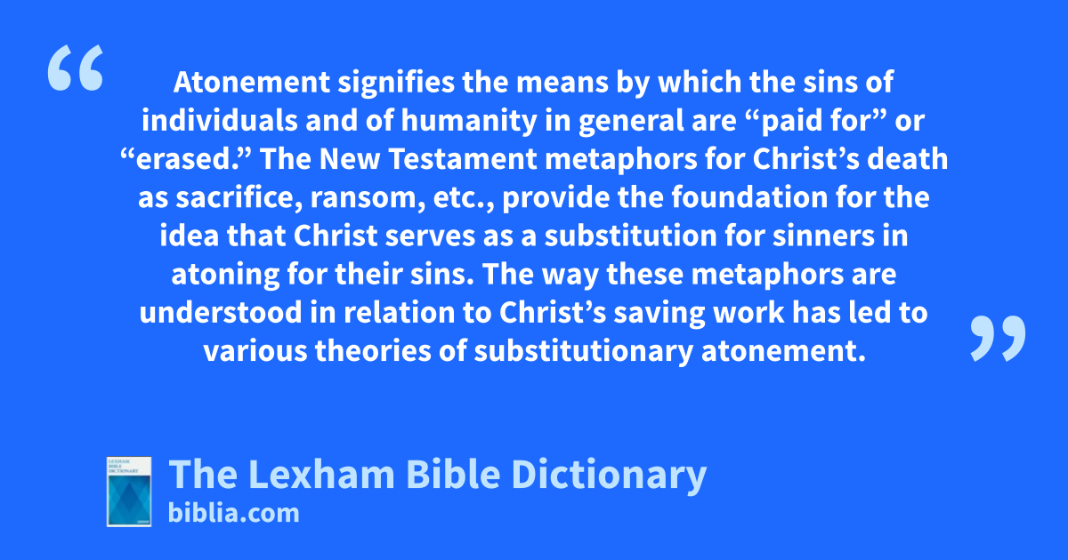 Atonement signifies the means by which the sins of individuals and of humanity in general are “paid for” or “erased.” The New Testament metaphors for Christ’s death as sacrifice, ransom, etc., provide the foundation for the idea that Christ serves as a substitution for sinners in atoning for their sins. The way these metaphors are understood in relation to Christ’s saving work has led to various theories of substitutionary atonement.