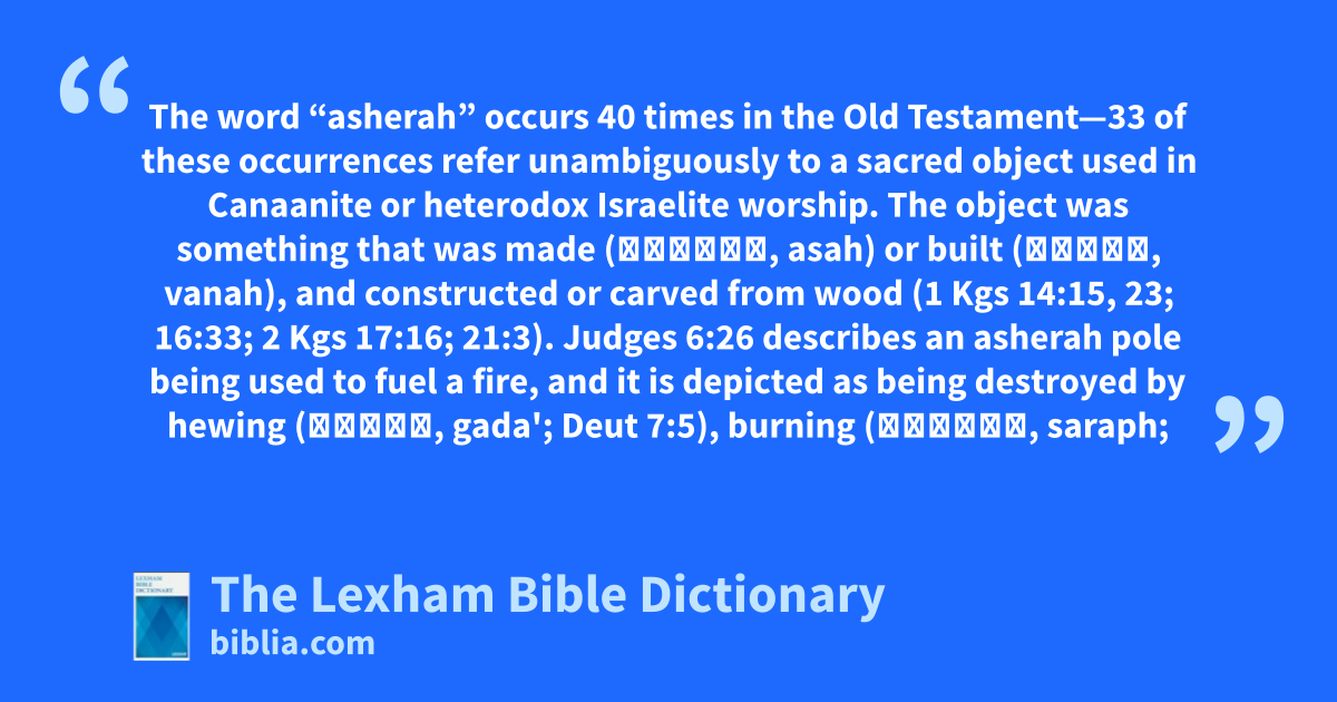 The word “asherah” occurs 40 times in the Old Testament—33 of these occurrences refer unambiguously to a sacred object used in Canaanite or heterodox Israelite worship. The object was something that was made (עָשָׂה, asah) or built (בָנָה, vanah), and constructed or carved from wood (1 Kgs 14:15, 23; 16:33; 2 Kgs 17:16; 21:3). Judges 6:26 describes an asherah pole being used to fuel a fire, and it is depicted as being destroyed by hewing (גָדָע, gada'; Deut 7:5), burning (שָׂרַף, saraph; Deut 12:3; 2 Kgs 23:6), cutting down (כָרַת, kharath; Judg 6:25, 28, 30; 2 Kgs 18:4) and uprooting (נָתַשׁ, nathash; Mic 5:14). Deuteronomy 16:21 prohibits planting (נָטָע, nata') an “asherah tree,” which may indicate that a natural tree could also serve as an asherah.