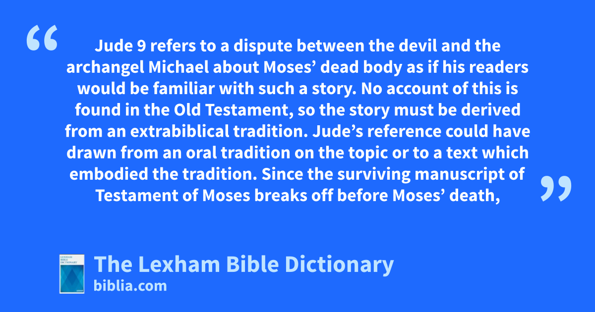 Jude 9 refers to a dispute between the devil and the archangel Michael about Moses’ dead body as if his readers would be familiar with such a story. No account of this is found in the Old Testament, so the story must be derived from an extrabiblical tradition. Jude’s reference could have drawn from an oral tradition on the topic or to a text which embodied the tradition. Since the surviving manuscript of Testament of Moses breaks off before Moses’ death, it is not obvious whether it contained a version of this tradition; no other surviving pseudepigraphal work about Moses contains this episode either (Priest, “Testament,” 924). compare Charles, Pseudepigrapha, 407–09; Bauckham, Jude, 235–270). However, several early Christian writers mention or cite noncanonical texts that may be related to the Jude 9 reference and/or the Testament of Moses, as described below (Charles, Pseudepigrapha, 407–09; Bauckham, Jude, 235–270).