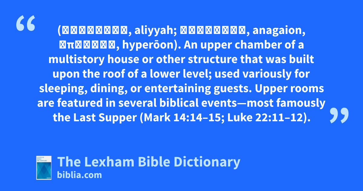 Upper Room (עֲלִיָּה, aliyyah; ἀνάγαιον, anagaion, ὑπερῷον, hyperōon). An upper chamber of a multistory house or other structure that was built upon the roof of a lower level; used variously for sleeping, dining, or entertaining guests. Upper rooms are featured in several biblical events—most famously the Last Supper (Mark 14:14–15; Luke 22:11–12).