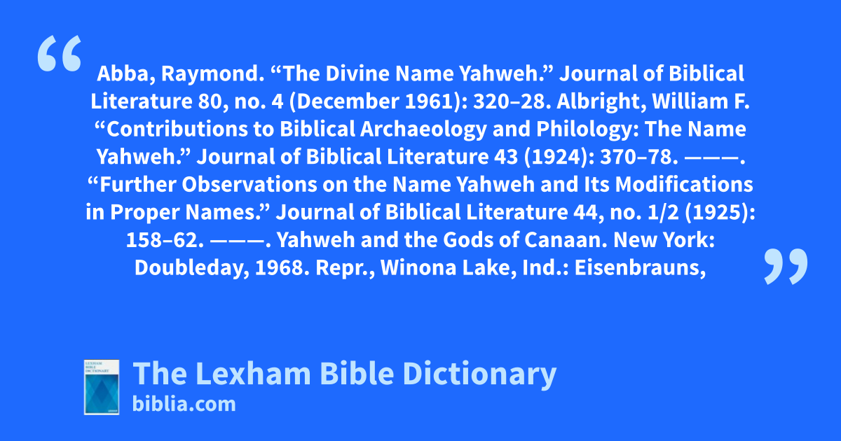 Abba, Raymond. “The Divine Name Yahweh.” Journal of Biblical Literature 80, no. 4 (December 1961): 320–28.