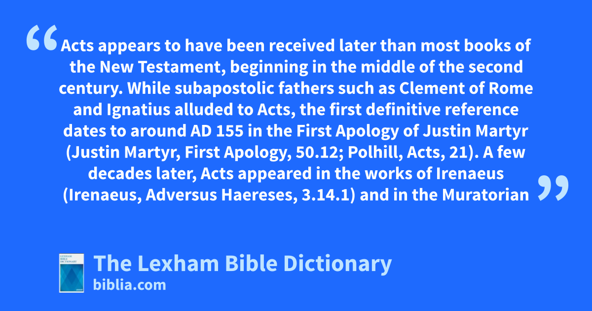 Acts appears to have been received later than most books of the New Testament, beginning in the middle of the second century. While subapostolic fathers such as Clement of Rome and Ignatius alluded to Acts, the first definitive reference dates to around ad 155 in the First Apology of Justin Martyr (Justin Martyr, First Apology, 50.12; Polhill, Acts, 21). A few decades later, Acts appeared in the works of Irenaeus (Irenaeus, Adversus Haereses, 3.14.1) and in the Muratorian Fragment. From that time onward, Acts was referenced regularly in the writings of the church fathers and was accepted into the canon without issue.